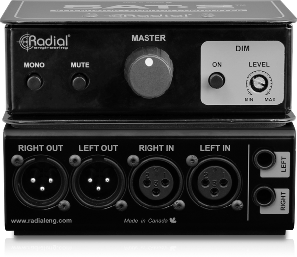 Radial SAT-2 là thiết bị điều chỉnh âm lượng (attenuator) stereo & bộ điều khiển monitor hoàn toàn thụ động (passive), dùng để kiểm soát mức tín hiệu line-level hoặc outputs mạnh để tránh clipping, cân bằng âm giữa hai kênh, cũng như điều khiển monitor trong studio, phòng thu, live hoặc môi trường làm việc có thiết bị khuếch đại. Nó thường đặt ở đường ra của interface hoặc sau preamp để giảm mức tín hiệu nếu cần, hoặc dùng giữa thiết bị phát và loa active để thay đổi âm lượng tổng (master volume) mà không ảnh hưởng tới preset volume vốn có. Cấu trúc đơn giản nhưng chất lượng cao, thiết kế vỏ thép chắc, bộ điều khiển âm lượng lớn, các công tắc dim, mute, mono hỗ trợ kiểm tra pha và nhanh chóng tạm thời giảm âm thanh.